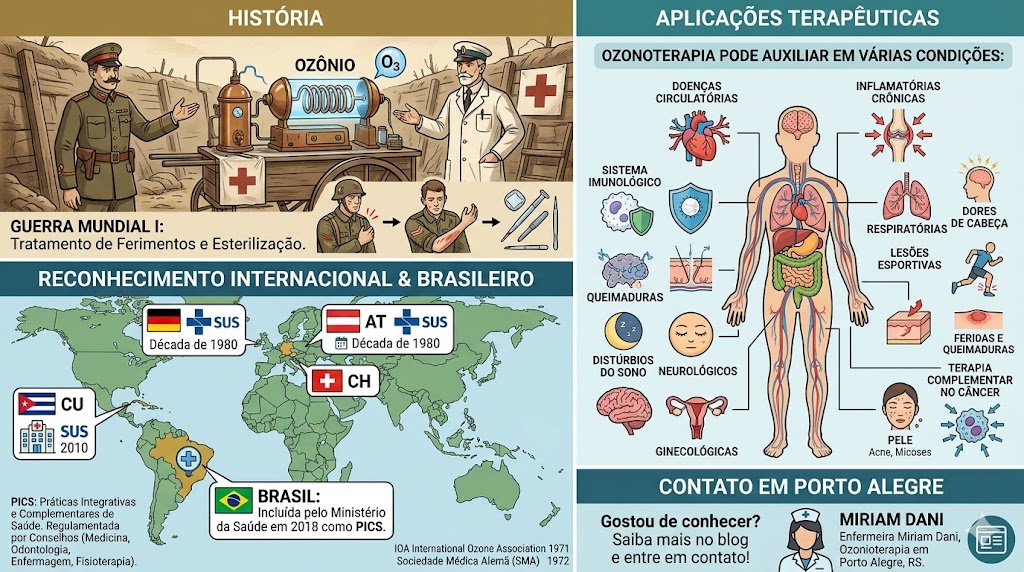 Hoje, a ozonioterapia é considerada uma prática complementar que pode auxiliar no manejo de diversas condições de saúde. Entre as principais indicações, destacam-se doenças circulatórias e cardiovasculares, como a aterosclerose, angina e hipertensão; doenças inflamatórias crônicas, como artrite e colite; distúrbios do sistema imunológico, incluindo HIV e lúpus; além de problemas respiratórios, como asma, bronquite e sinusite.